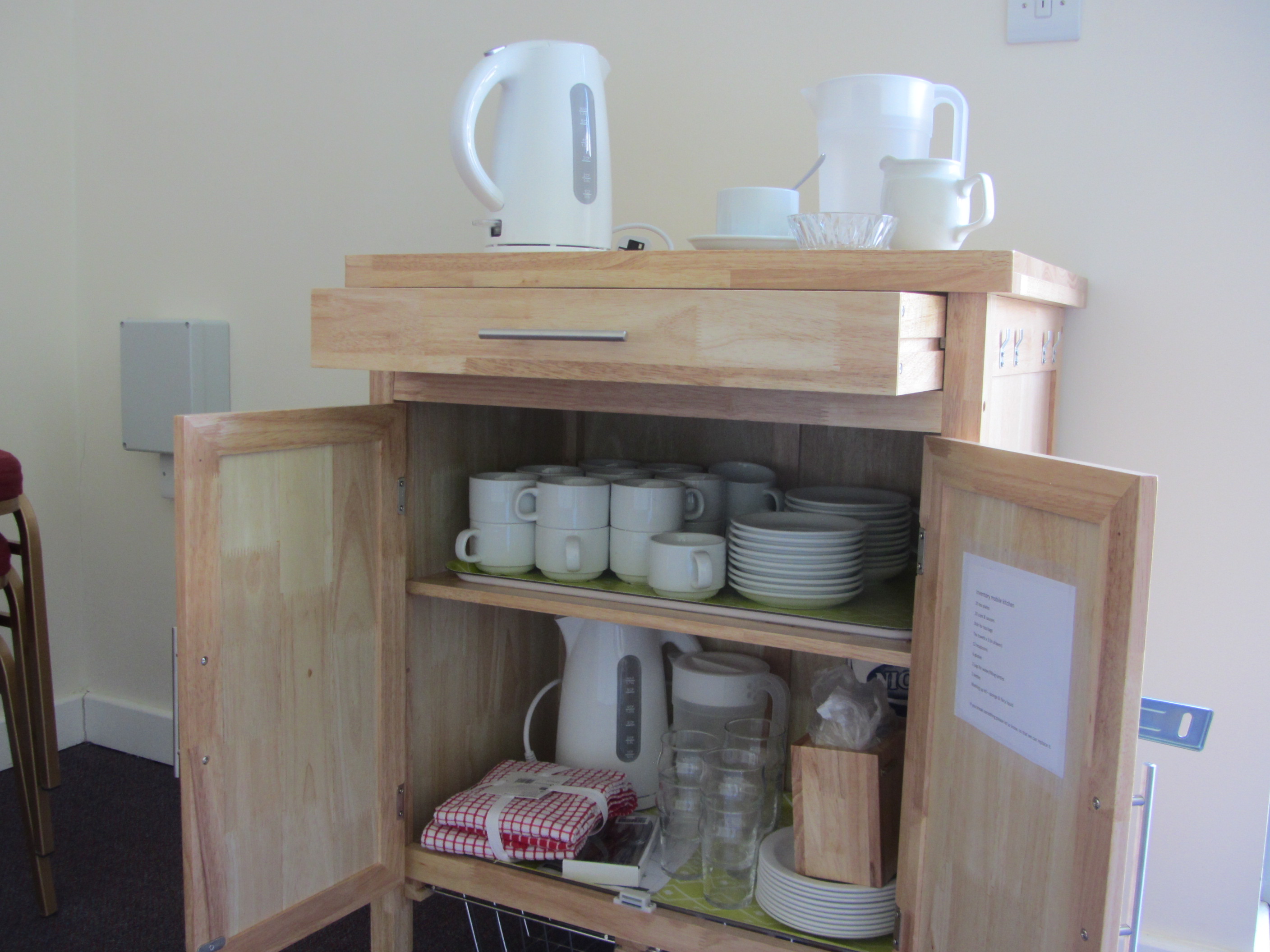 up to 25 seated;Dimensions: approx 8m x 4.3m (26 x 14ft) (Height 2.79m (9ft)) A trolley containing crockery, kettles etc for use with light refreshments is available in the meeting room.